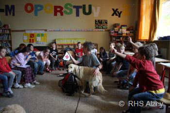 Wieder einmal hieß es für einige unserer Vierbeiner den Schulalltag zu bereichern. In der Flonheimer Schule durften Shari, Yuma, Nelli und Zack den Kindern der 2. Klassen die Arbeit und Ausbildung der Rettungshunde nahebringen. Im Klassensaal ging es dabei zunächst um theoretischen Themen, wie “Der Geruchsinn des Hundes”, “Wie suchen Rettungshunde”, “Das Einsatzequipment des Rettungshundeteams”, etc. bevor es dann im Schulhof praktisch zur Sache ging! Shari zeigte dort, wie man im “Null Komma Nix” jemanden im Gestrüpp aufgespürt und verbellt hat. Spannend war für die Schüler schließlich noch die Besichtigung des Einsatzautos der Staffel.