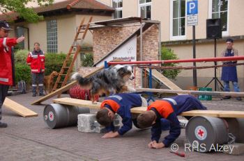 Tierisch heiß war es auf dem Hundstag in Worms . Unsere Hundestaffel durfte gleich in zwei Vorführungen zeigen, was die Hunde gelernt haben. Mit dem Kommando „voran“ kletterten die Hunde über die unterschiedlichsten Geräte der verschiedensten Schwierigkeitsgraden. Zwei Freiwillige aus dem Publikum legten sich über die Fassbrücke und die Hunde sprangen auf der Brücke über die menschlichen Hindernisse. Auch die beiden „Opfer“ wurden von Hexe schnell gefunden und mit lautem Bellen angezeigt. Bei der Anzeige ließ sich der Golden Retriever Joker lieber auf der Trage von den „Sanitäter“ wegtragen, während seine Hundeführerin noch das „Opfer“ versorgte. Trotz der großen Hitze waren die Hunde mit Freude und Motivation bei der Sache. Die Besucher beteiligten sich großzügig an der Tombola und spendeten in das Körbchen, das von dem Hundemädchen Nelly durchs Publikum getragen wurde. Der Erlös der Tombola wurde ebenfalls der Staffel gespendet. Ein herzliches Dankeschön an die Hundefreunde und die Ausrichter des Hundstags.