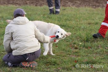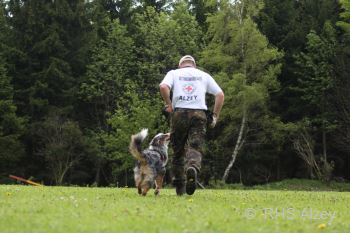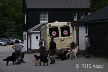 Wieder einmal ging es zu einer Prüfungsveranstaltung, bei der ein Team unserer Staffel angemeldet war. Die RHS Ingelheim war Ausrichter der 3. Landesverbandsprüfung in diesem Jahr. 9 Prüflinge aus Altenkirchen, Alzey, Koblenz, Idar-Oberstein, Dillenburg und der JUH Bonn/Rhein-Sieg stellen sich den Prüfungsaufgaben. Bei optimalen Wetterbedingungen ging es auf dem Sportplatz in Daxweiler mit Verweis, und Gehorsamsprüfung los. Hier sah man durchweg ein gutes bis sehr gutes Arbeitsniveau, so dass alle Teilnehmer sich für die anschließende Suche qualifizierten. In einem anspruchsvollen Gelände galt es dann zwei Personen zu finden und diese entsprechend sanitätsmäßig zu versorgen. Leider konnten nicht alle Teams diesen Teil erfolgreich abschließen. Um so mehr freuen wir uns mit Beate und Arnold, die die gestellte Aufgabe mit Bravour abarbeiteten und sich nun als geprüftes Flächenteam in das Einsatzteam unserer Staffel einreihen dürfen. Herzlichen Glückwunsch! Ein riesen Dankeschön geht aber vor allem an die Ingelheimer Staffel, die eine tolle Organisation geleistet hat und die beiden Prüfer Bitta Edinger (JUH) und Klaus-Dieter Herrman (DRK).