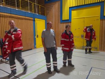 Aufgrund der Unwetter im Donnersbergkreis waren auch die Helfer des DRK Kreisverband Alzey von der Rettungsleitstelle Mainz alarmiert worden. In Gerbach im Donnersbergkreis musste aufgrund der Wassermassen ein Zeltplatz evakuiert werden. Der DRK Kreisverband Alzey stellte in einer Turnhalle in Rockenhausen Feldbetten auf und verteilte Decken. Auch Mitglieder der Rettungshundestaffel waren hierbei im Einsatz..