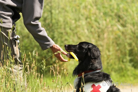 Neben dieser Basisarbeit ist eine weitere wichtige Grundlage der Ausbildung, die Anbahnung der Anzeigeform, d.h. die Art und Weise, wie der Hund seiner/seinem Hundeführer*in "mitteilt", dass er eine Person gefunden hat. Vorranging bilden wir in unserer Staffel Hunde im "Verbellen" aus. Eine Anzeige durch "Bringseln" oder "Rückverweisen" ist aber auch möglich. (Begriffserklärung siehe unten)