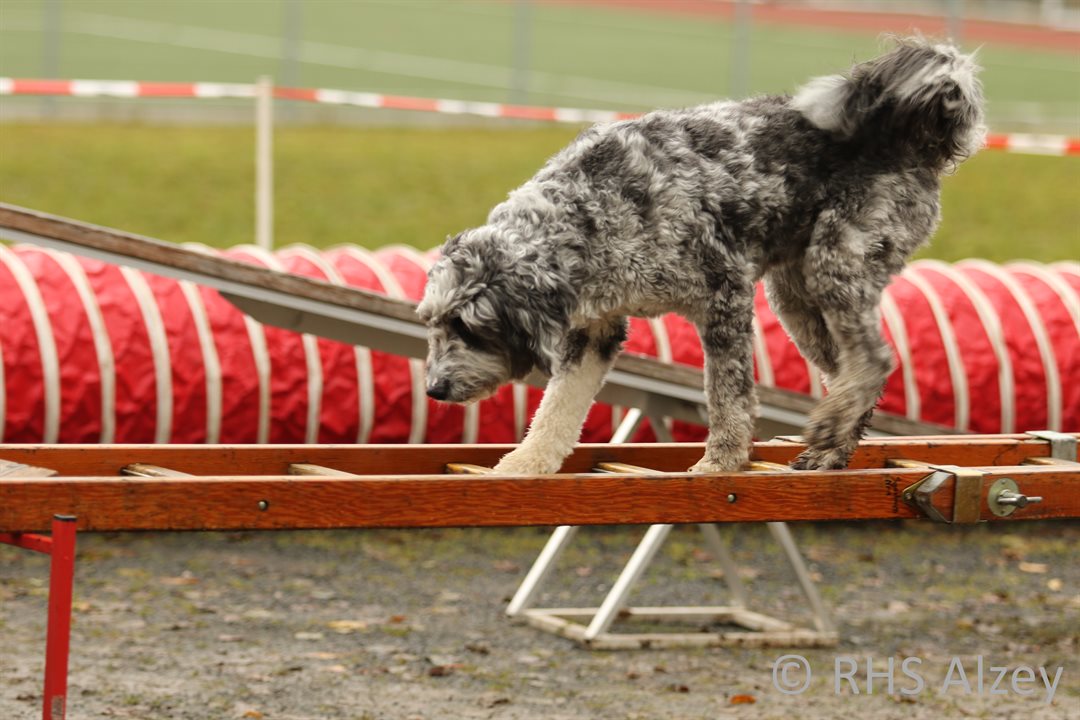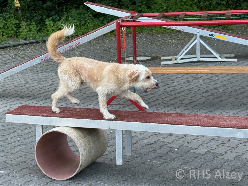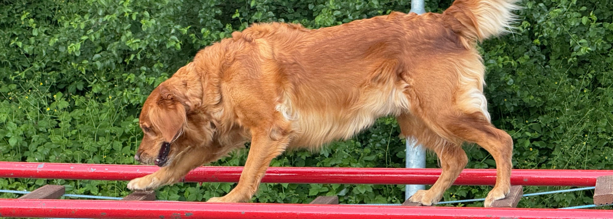 Für die Ausbildung nutzen wir unterschiedliche Gerätschaften aber auch natürliche "Hindernisse". So lernt der Hund über schmale Stege zu gehen, Leitern zu steigen, Wippen zu überqueren, wackligen Untergrund zu passieren, glatte Steigungen zu überwinden, etc.